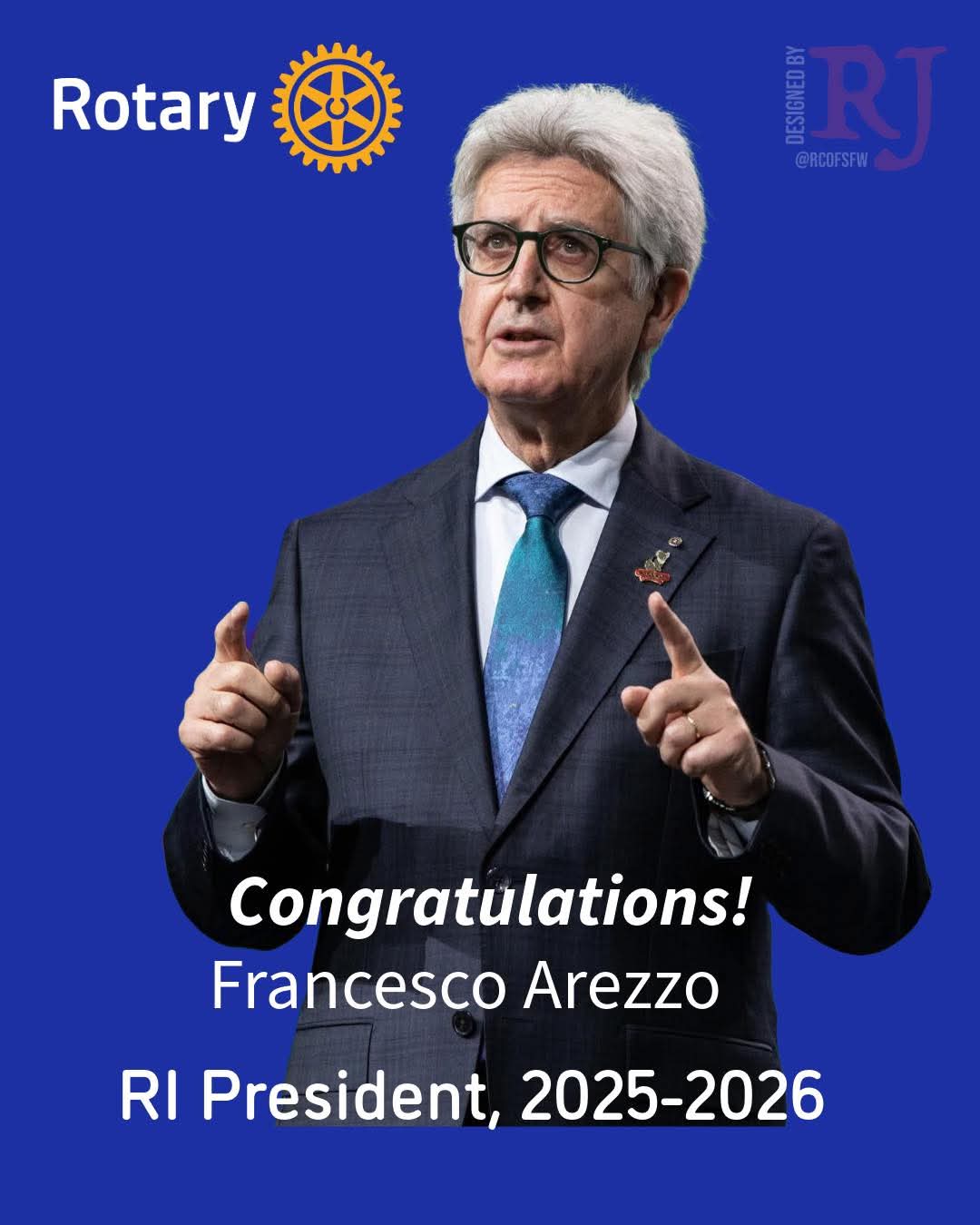 Francesco a Rotarian for more than 30 years is a member of the Rotary Club of Ragusa, Italy and has been selected by the Board of Directors to become Rotary International's president for 2025/26. The board conducted a special session following the unexpected resignation of RI President-elect Mario on the 8th June 2025.