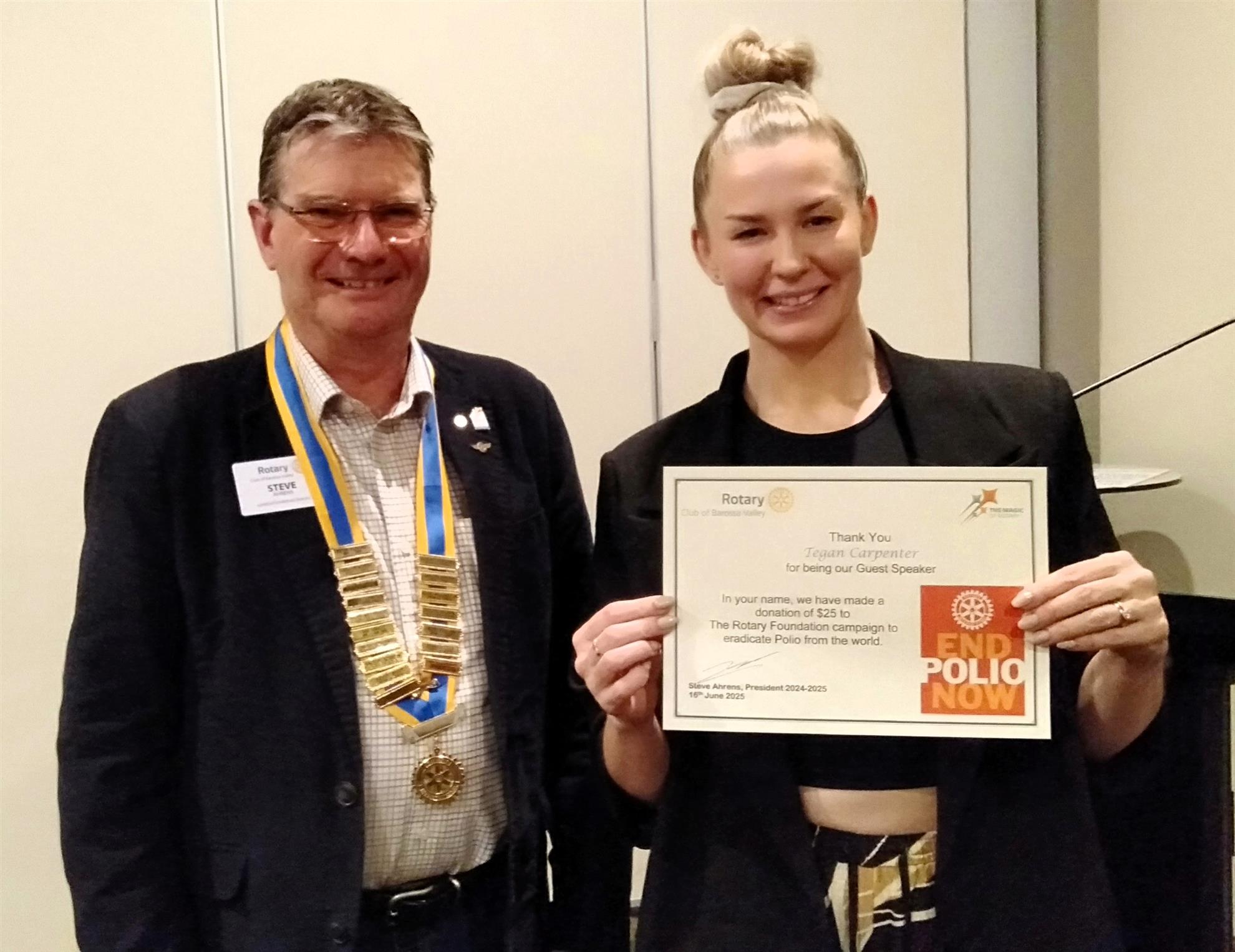 given by Tegan Carpenter with a big Thank You for being our Guest Speaker. President Steve handed her the usual certificate which states, "In your name we have made a donation of $25 to The Rotary Foundation campaign to eradicate polio from the world". Tegan was so impressed with the certificate she made a further donation of $100 towards Rotary's End Polio Now.